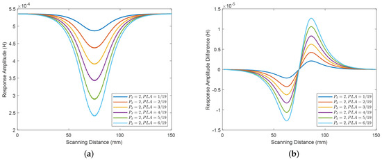 Inductance variation simulation of the self−inductance coil with flaws of different axial lengths, with PLA = 6/19, (a) Original simulated signal (b) Differential of the original signal.
