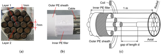 The signal sampling unit, depicted in Figure 5, was comprised of a cable, PE sheaths, a cable holder, and a positioning slide platform system. As shown in Figure 6a, the cable specimen consisted of parallel single-stranded galvanized steel wires arranged in a specific order, with a diameter of 7 mm. The whole cable was surrounded by PE material, which included a 1 mm PE sheath and six layers of 0.2 mm PE tape. The PE tape filled the space between the outer sheath and the cable. Flaws were systematically deployed in the middle of different layers. The diagrams of the flaw are presented in Figure 6c, where the axial length of the flaw is denoted by d. To generate flaws of varying axial length d, the distance between both sides of the wires was incrementally adjusted from 0 mm to 40 mm with a step size of 10 mm.