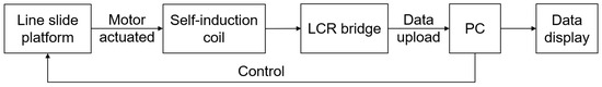 The cable specimen was suspended by holders situated above the slide-way and traversed over a self-induction coil that was fixed to a mobile platform. The coil was composed of 300 winding of 0.3 mm enameled copper wire and possessed an external diameter of 80 mm, an inner diameter of 70 mm, and a thickness of 2.1 mm. The coil’s inductance was accurately measured in real-time with an LCR bridge. A frequency range from 1000 Hz to 10,000 Hz was chosen to analyze the influence of the excitation frequency on the coil’s self-inductance response and determine the most appropriate excitation frequency. Five anchor frequencies were selected to divide the frequency band, and the logarithm of the frequencies was employed to reduce the range span. The experiment involved moving the coil along the slide-way to detect flaws inside a cable. The scanning distance was 300 mm. The signals were then uploaded to a host computer for display and processing. Figure 7 presents the entire experimental procedure. Table 1 shows the detailed experimental parameters. The experiments are labeled as , where i represents the flaw location and j represents the flaw cross-sectional area on the i-th layer. For instance, denotes the situation of and .