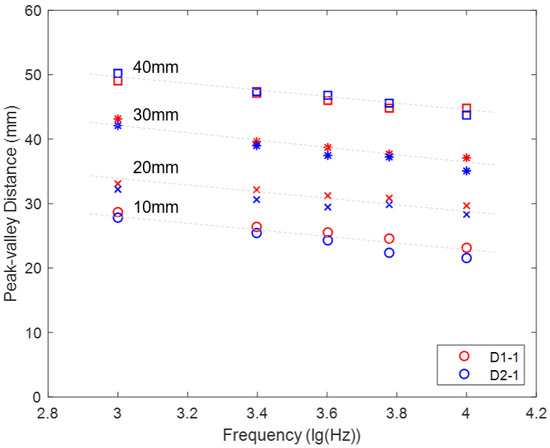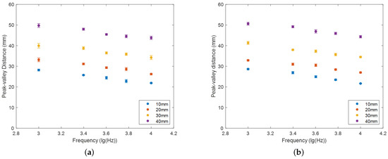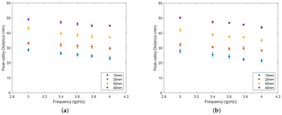 Furthermore, in order to minimize the influence of the flaw location, a follow-up experiment was carried out under . The experiment was repeated five times to obtain the mean and standard deviation values, which are presented as error bars in Figure 10b. Both Figure 10a,b demonstrate a downward trend in the peak-valley distance as the excitation frequency increases.