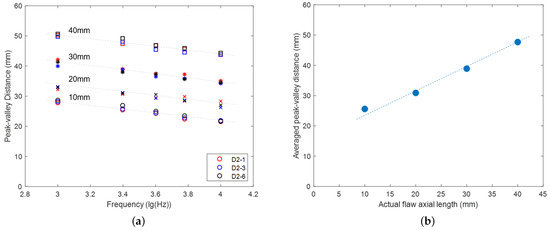 Diagram of the relationship between flaw axial length and peak−value distance (a) Peak−valley distance comparison of different cross−sectional area flaws on Layer 2 (b) Graph of relationship between flaw axial length and averaged peak−valley distance at 2500 Hz excitation frequency.