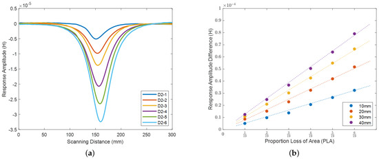 Figure 16a displays the offset response values of 10 mm flaws with different cross-sectional areas at 2500 Hz excitation frequency on Layer 2. To quantify the amplitude of each situation, the absolute amplitudes were calculated on the basis of Equation (6) and averaged. The results were presented in Figure 16b. The figure shows a clear trend in the response amplitude of the self-inductive coil as the flaw cross-sectional area decreases under . The response amplitude experiences significant attenuation, indicating a linear relationship between the flaw cross-sectional area and the self-inductive coil response amplitude. These findings reveal a positive correlation between the flaw cross-sectional area and the self-inductive coil response amplitude for flaws located at the same depth inside the cable.