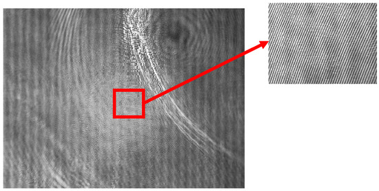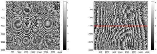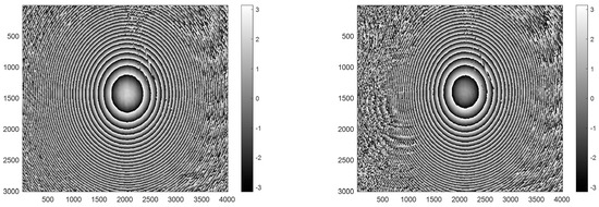 A reference hologram of air without a candle flame was recorded and is shown in Figure 3. The interference pattern includes the information of both the reference beam and the object beam passing through the air. The direction of the interference fringes can indicate the tilt angle between the reference beam and the object beam. This direction is also related to the direction of the twin side lobes in the Fourier domain, as can be seen in the spectrum of the recorded hologram in Figure 2. The hologram was reconstructed using the numerical reconstruction method described in the previous section. The phase distribution map of the reference hologram was then extracted using Equation (5), revealing the wrapped phase representation shown in Figure 4 (left). This wrapped phase map demonstrates a periodicity of 2π modulo (due to the nature of the arctan function).