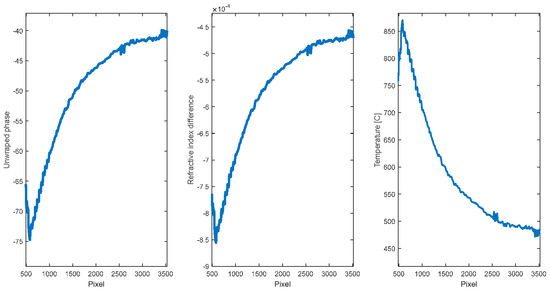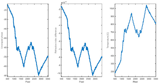 As observed, the phase change map wraps quickly on the left side and gradually becomes slower from left to right. The hologram quality is higher in the interval from pixel number 500 to 3500 on the horizontal axis, where the results are shown and discussed. So, a cross-sectional profile plot of the phase difference map at pixel row number 1500 (red line) was chosen and plotted in Figure 5 (left). The line profile of the wrapped phase indeed reaches minima at positions that correspond to dark fringes. In Figure 6 (left), the unwrapped phase changes of the chosen line are plotted. The unwrapped phase initially decreases and then sharply increases until the end. The slope of the increment decreases as it moves towards the right. Using Equation (9), the refractive index differences are also plotted and shown in Figure 6. Similar to the phase changes, the refractive index first decreases, changes slope, and then sharply increases until it reaches the end, becoming smoother. The change in the refractive index is proportional to the phase difference with a proportionality coefficient factor of 2πL/λ. By using the relation introduced in Equation (12), the temperature variation is calculated and plotted in Figure 6, left. Contrary to the refractive index and phase changes, as we move away from the center towards the outer region of the flame, the temperature first increases from 575 °C to almost 650 °C and then gradually decreases until the end.