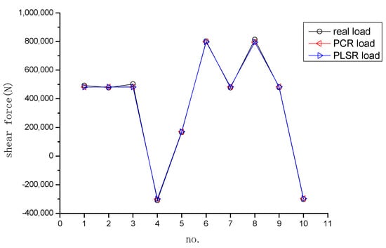 It can be seen that the regression shear forces are very close to the actual shear force, with all relative errors below 0.05 and most below 0.03. In comparison, the regression results of PCR and PLSR vary relatively. In some cases, the results of PCR are better than those of PLSR, while in others, the results of PLSR are better than those of PCR.