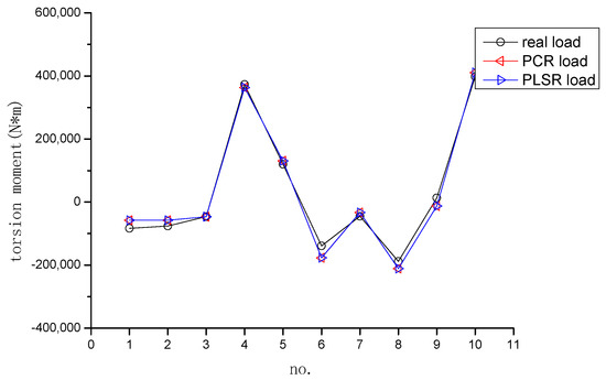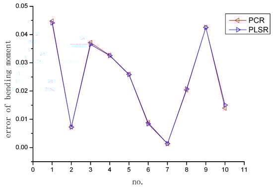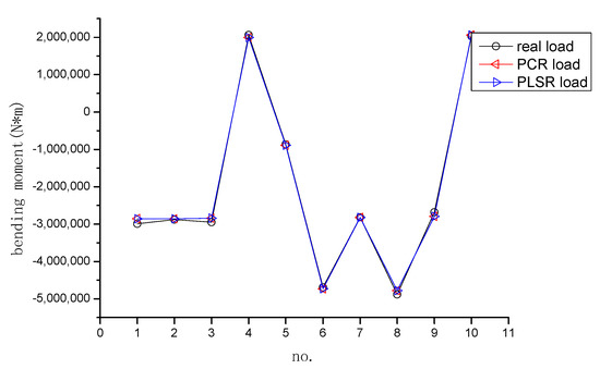 It can be seen that the regression bending moments are very close to the actual bending moment, with all relative errors below 0.05 and most below 0.04. In comparison, the regression results of PCR and PLSR vary relatively. In some cases, the results of PCR are better than those of PLSR, while in others, the results of PLSR are better than those of PCR.