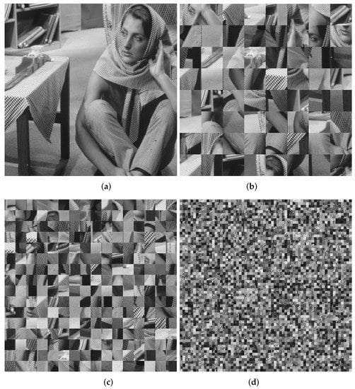 The Jigsaw transform is a popular scrambling technique to hide visual information in digital images. Its name is reminiscent of an image cut into pieces of different sizes that must be joined correctly to form the picture again. It is considered a nonlinear operator, which rearranges sections of an image following a random ordering [43]. The direct JST breaks a grayscale image into non-overlapping blocks of pixels, each one of which is moved to a location following a random order. In the same way as the direct JST (), the inverse Jigsaw transform () uses the initial order of the sections to recover the original image. The JST holds the energy of a grayscale image () and is, therefore, considered a unitary transform (Equation (1)).
