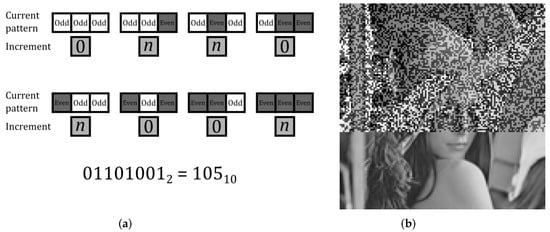 Variation of the ECA with Rule 105. (a) Increment on the value of a cell based on each possible neighborhood of the cell in the same column in its parent row. (b) Our modified ECA was applied on a gray image using 80 iterations, with .
