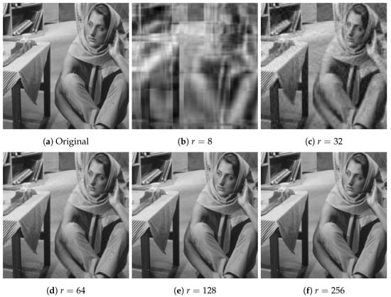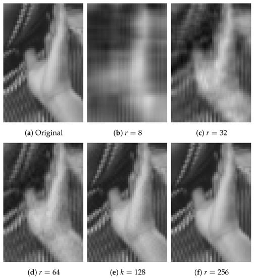 Figure 6 shows the image approximation using SVD over a grayscale image of for , and Table 1 reports the correlation coefficient (R), which is calculated using the original image and the reconstructed image, where using only of the singular values ( of 256), a correlation value of is achieved. In addition, Figure 7 shows the zooming of a region of the original image, where both homogeneous and texture regions are presented.