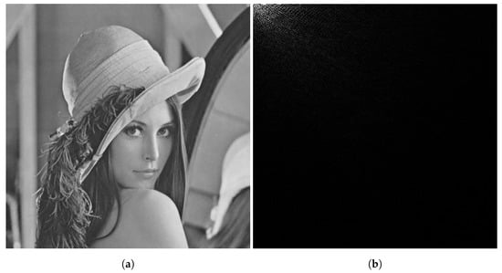 The DCT serves as the foundation for numerous image compression techniques and lossy digital image compression systems: Joint Photographic Experts Group (JPEG) for still images and Moving Picture Experts Group (MPEG) for video images [48]. It is a mathematical tool to perform frequency analysis without complex numbers and to approximate a typical signal using fewer coefficients (low-, high-, and middle-frequency components), i.e., it can pack the most information in the fewest coefficients and pack energy in the low-frequency regions [49,50]. One of the most-usual applications is in signal and image processing for lossy compression because of its property to compact strong energy, creating predictions according to its local uniqueness. Besides, as mentioned in [51], this transform has entropy retention, decorrelation, and energy retention–energy concentration, among which energy concentration is of great significance to digital image encryption. Therefore, the most-important DCT advantages, such as a high compression ratio and low error rates [52], are taken into account in different applications, such as digital image encryption, because the energy concentration is a very important element. When we applied the DCT to an image (matrix), we obtained a DCT coefficient matrix that contained the DC coefficient and the AC coefficient. The energy was concentrated in the DC element. As an example, the Lena image and its transformation applying the DCT are shown in Figure 8.