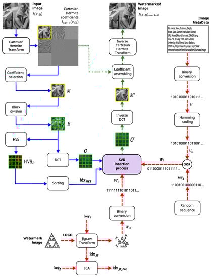 Therefore, in a watermarking image method, the watermark must be robust and imperceptible or perceptible, depending on the application. In this paper, we propose a hybrid, robust, and imperceptibility watermarking approach using the Hermite Transform (HT), Singular-Value Decomposition (SVD), the Human Vision System (HVS), and the Discrete Cosine Transform (DCT) to protect digital images. As watermarks, we used a digital image LOGO and image MetaData (with information about the original image or the owner), so we inserted two different digital contents into a digital image. The Hermite transform is based on the Gaussian function derivatives, and it incorporates human visual system properties, so it allows a perfect reconstruction of the image. To have more security, the LOGO is encrypted using the Jigsaw Transform (JST) before inserting. In addition, the indexes to decrypt the LOGO are secured using the Elementary Cellular Automaton (ECA), increasing the security of the proposal. In addition, the image MetaData are secured using a random sequence generator and the XOR operation. Finally, the Hamming error correcting code was applied to the image MetaData to reduce channel distortion.