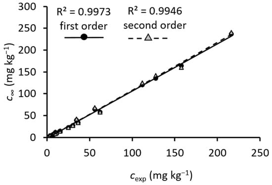Correlation between c∞ (mg kg−1 FW) predicted with the first- and second-order kinetic models and cexp (mg kg−1 FW) experimentally determined. c∞ and cexp are concentrations of phenolic compounds at the endpoint of the reaction predicted by models or experimentally determined, respectively.