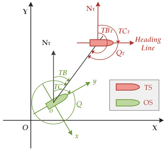 In this work, we adopt the coordinate system depicted in Figure 1. The geodetic fixed coordinate system XOY is established with as the origin coordinates. The positive directions of the X and Y axes point to the true east and true north, respectively. The coordinate system XOY fixed to the own ship (OS) is established. The center of gravity of the OS is set as the origin, and the positive directions of the x and y axes point to the starboard abeam and bow of the OS, respectively. True course () of OS is the angle between the and axes, true bearing () of target ship (TS) is the angle from -axis to the bearing line, and relative bearing () is the angle from OS heading line to the bearing line. The relationship between , , and is shown in Equation (1).