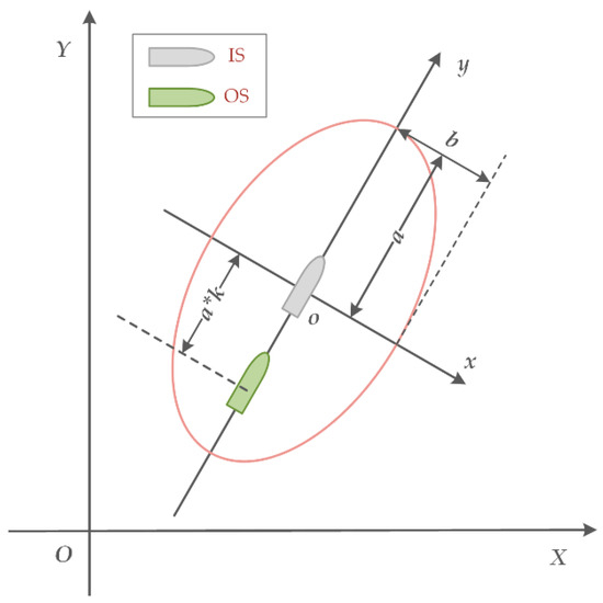 Based on the previous description, a symmetrical elliptical ship domain model with an offset center is adopted in this study. The imaginary ship is located at the center of the ellipse and at a distance of a*k before the OS. The model parameters are selected with the length of the OS (L) as the reference unit. The long and short axis of the ellipse field is set as a = 5 L and b = 2 L, respectively. The eccentricity coefficient k is 0.7. In future practical applications, the size of the parameters in the model can be adjusted by the captain according to the navigation environment and the ship’s maneuverability.