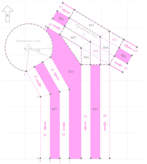 In Figure 3, each TSS features two traffic lanes and four boundary lines (numbered from east to west as 1, 2, 3…), with n points (numbered from north to south as 1, 2, 3…) on each boundary line. denotes the -th point on the -th boundary line of the -th TSS in this study. The traffic lanes are further divided into 16 segments based on distinct traffic flow directions and the places from where they occupy. The TSS does not prescribe a course in the precautionary area. According to COLREGs, when a vessel joins or leaves from either side, it must do so at the smallest possible angle to the general direction of traffic flow. In this study, we set up a virtual traffic lane in the precautionary area , and set the centerline of the traffic lane as the planned route based on the author’s real navigation experience and cluster analysis of the historical trajectories of ships in the study area [35].
