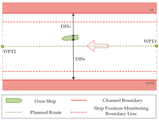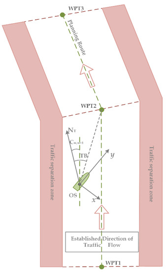 shows the planned route on the -th TSS’s -th traffic lane. The midpoint of the line between points and is represented by .