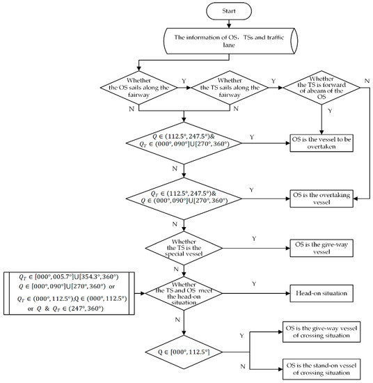 The responsibility of taking avoidance actions of OS can be identified as per “COLREGs” when the TS poses a risk of collision. Although certain target vessels have the obligation of not impeding, when the OS and special ships pose a risk of collision, the OS remains a give-way ship. For ordinary power-driven vessels, it can be determined by the encounter situation identification model.
