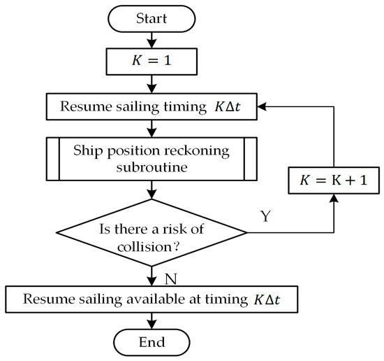 When the OS alters her course to avoid the TS, whether she can resume sailing will be assessed in the next time step. The discrete method can be used to find the earliest resume time. The diagram of Figure 11 depicts the specific calculating procedure.