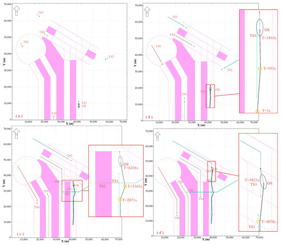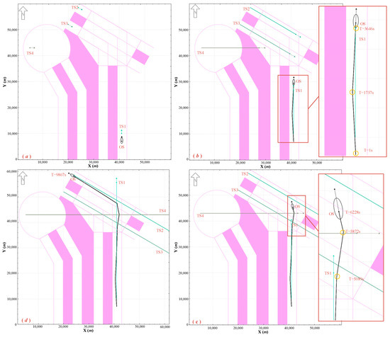In the experiment, four TSs were put up in the traffic environment of Chengshantou TSS waters. Table 3 contains the initial parameters of the OS and TSs. Figure 13a depicts the initial scene of the experiment, and Figure 13b–d displays the trajectory of the OS at different times.