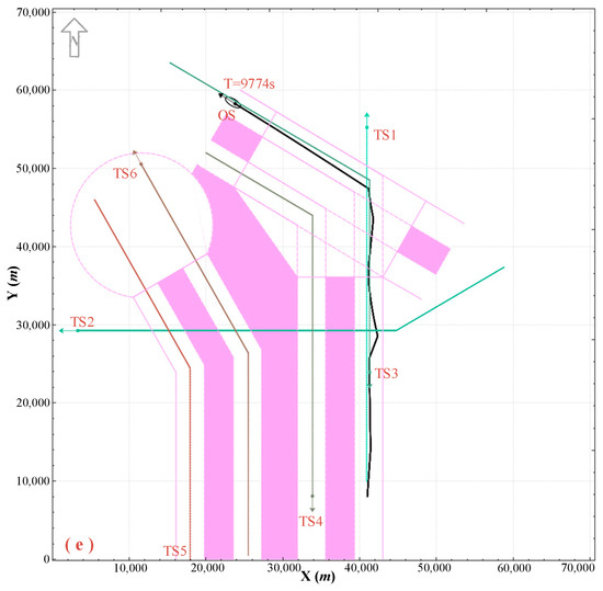 At T = 4858 s, OS is in a head-on situation with TS3, and the is 0.14. Figure 14d shows the trajectory of the OS course, altering 6° to the starboard to avoid collision and beginning the resuming of the planned route maneuver at T = 5823 s. Finally, the destination is reached when T = 9774 s, as shown in Figure 14e.