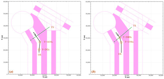 In Figure 16a, when T = 292 s, the OS identifies the presence of a collision risk and alters course by 18° to the starboard to avoid collision. When T = 1435 s, the OS begins to resume the planned route. In Figure 16b, when T = 1356 s, the OS identifies the presence of a collision risk and alters course by 23° to the starboard to avoid collision. When T = 2089 s, the OS begins to resume the planned route. It can be seen that the method proposed in this study can identify the collision risk earlier and make corresponding avoidance measures when the OS alters course along the traffic flow.