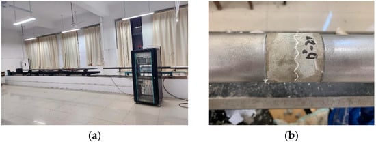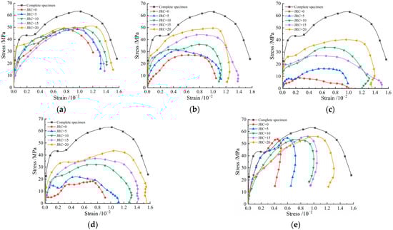 - Shear slip failure along the joint surface. As shown in Figure 5c, the joint surface with JRC of 0 is smooth at this time, hence the shear strength is very low, and the relative dislocation of the joint surface occurs, leading to the shear slip failure. Moreover, the cement mortar on both sides of the slip surface are almost complete, and no penetrating cracks appear.
