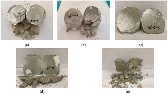 - Splitting tensile failure parallel to the joint surface. As depicted in Figure 5a,e and Figure 6e, jointed specimens predominantly exhibit splitting tensile failure parallel to the joint surface, resulting in the upper and lower parts of jointed specimens fracturing into multiple uniform-shaped small pieces, along with a few fragments. Regardless of the JRC, the failure of joint specimens with joint inclination angles of 0° or 90° is mainly attributed to splitting tensile, accompanied by a notable lateral expansion phenomenon.