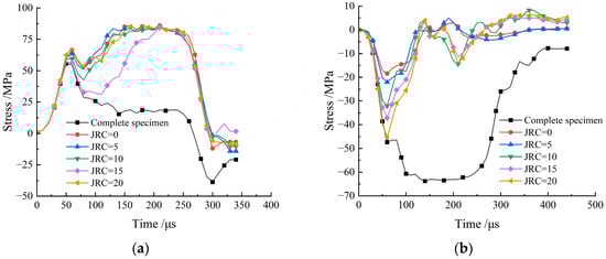 - The existence of joint inclination and roughness affect the stress wave propagation through the jointed specimen. When the JRC increases from 0 to 20, the reflection of stress waves on the joints gradually increases, and the transmission decreases for the joint inclination angles of 0° and 90°. On the contrary, when the joint inclination angle is in the range of 30° to 60°, the reflection of stress waves on the joints gradually decreases, and the transmission gradually increases with JRC increasing from 0 to 20.