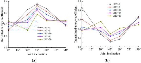 - With the increase of JRC from 0 to 20, the reflected energy coefficient gradually increases at joint inclination angles of 0° or 90°, while the transmitted energy coefficient decreases progressively. Additionally, with the increase of JRC, the reflected energy coefficient gradually decreases when joint inclination angle is in the range of 30° to 60°, while the transmitted energy coefficient gradually increases.