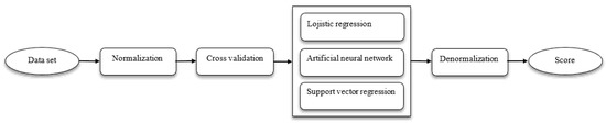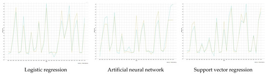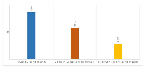 Figure 4 shows the coefficient of determination (R2) graphs. R2 shows the rate of explanation of independent variables. In other words, it refers to the variance ratio of the dependent variable explained by the independent variables. Here, zero indicates that the model has 0% explanatory power, and one indicates that the model has 100% explanatory power and that the independent variables are strong in explaining the dependent variable and provide a linear curve [38,39]. R2 was 94.9% for logistic regression, 93.6% for artificial neural networks, and 92.3% for support vector regression. These results show that the ideal values were met.