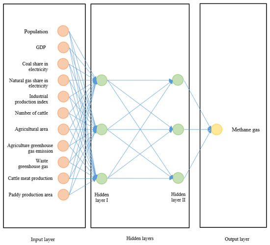 Turkey, which has both agricultural and industrial activities and cannot reduce coal use in energy production to the desired level, was selected as a sample country. Data covering the annual period between 1990 and 2020 were used. The data set was created from the data obtained from the Turkish Statistical Institute (TUIK) database. The data set consisted of 372 data in total. While designing the model in the study, the variables affecting the emission of methane gas and the contribution of these variables to methane emission were formed around three main categories. The first and most important factor influencing methane gas emission is the agricultural activity of a country. The largest methane gas emission resulting from agricultural activities is caused by enteric fermentation. Enteric fermentation is the digestion of food by microorganisms in the digestive system of cattle. As a result of this process, methane gas is formed as a by-product. For this reason, the number of cattle in Turkey was determined as the input variable for red meat production in the model. Another agricultural activity that causes methane gas emissions is paddy cultivation. During the cultivation process of paddy, a large amount of water must be kept on the field surface for a long time. As a result, the organic materials in the soil remain in an oxygen-free environment and cause methane gas emission. Considering this situation in paddy cultivation, the surface area of cultivated paddy fields was added to the model. The last methane gas emission factor, which was accepted as an input variable in the category of agricultural activities, is the burning of biomass in agricultural areas. As a result of this combustion, methane gas is released to the atmosphere from the organic residues in these areas. The size of agricultural surface area and agricultural greenhouse gas emissions were, therefore, included in the model. The second main category of causative factors for methane gas emissions is the production and utilization processes of coal and natural gas, which are fossil energy sources. During the production (including enrichment), storage, and distribution phases of natural gas, methane gas, which is the main component of this gas, is released and causes emissions. At the same time, methane emissions occur during the extraction of coal, another fossil-based fuel (especially in closed underground mines). The share of these two fossil fuels in total energy production was added to the model as a variable. Since these two fossil fuels are used especially in manufacturing and heavy industry, the industrial production index was also added to the model. The third main factor category in the formation of methane gas emission is waste. Especially in landfill areas, where domestic wastes accumulate, there is a high rate of organic waste, which increases methane gas emission. For this reason, greenhouse gas emissions of wastes were also added to the model. The general variables of population and gross domestic product of the country, which are considered to affect all three main categories of emission causes, were also added to the model. The model is shown in Table 2.