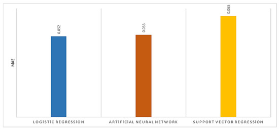 The mean absolute error (MAE) graphs are presented in Figure 5. MAE is calculated by averaging the absolute values of the prediction errors. It is often preferred for determining the error values of models because it can be easily interpreted. The MAE value can vary from 0 to ∞. The lower the MAE value, the lower the error value of the model [40,41]. The MAE metric gives the magnitude of the error as a quantity. In the study, it was seen that the MAE was 0.052 for logistic regression, 0.053 for artificial neural networks, and 0.065 for support vector regression. The MAE was considered to be successful in all three models.