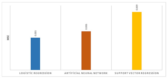 Figure 6 shows the mean squared error (MSE) graphs. MSE is a statistical metric that evaluates the error of machine learning methods. MSE is equal to the mean squared difference between predicted values and actual values. MSE is often used in regression models. Because MSE squares the error, it causes major errors to be clearly highlighted. MSE is a metric that ranges from 0 to infinity, and values close to zero are considered better [42,43]. It was seen that the MSE was 0.005 for logistic regression, 0.006 for artificial neural networks, and 0.009 for support vector regression. The error rate of the models was found to be low and acceptable.