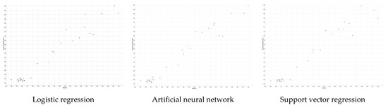 According to the error and success evaluation, the order of the models in terms of their success is logistic regression, then artificial neural network and, finally, support vector regression. Figure 7 shows the scatter plots of the models.