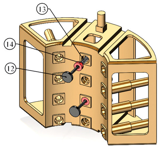 In this research, the proposed gripper comprises multiple components, as illustrated in Figure 1 and listed in Table 1. At the core of the mechanism are three shutter components (#5), which are three equal pieces of a cylindrical extrusion. The shutters contain small holes (cylinders) intended for the insertion of small pistons (#12) and springs (#13), which, together, function as flexible grippers. Also, each shutter contains a small column on the top and bottom faces. Half of the column on top has a rectangular extrusion, the other half has a cylindrical extrusion, and the bottom column only has a rectangular extrusion (Figure 2). These columns enable the shutter to slide inside the circular plates above and below.