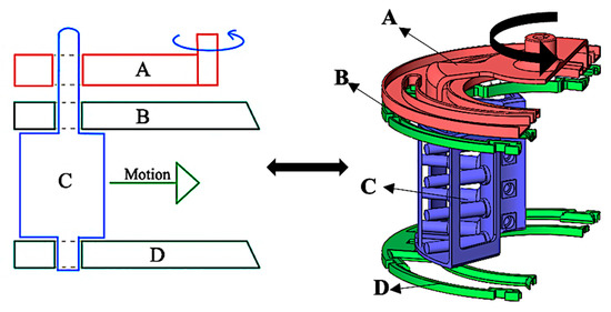 The side view of the moving parts in the proposed mechanism is shown in Figure 4. The motion begins with the curvilinear slot plate (Part A), which is rotated by the motor. The curvilinear slot plate drags the shutter (Part C), which is guided toward the direction of the motion by the rectangular slot plate (Part B). Because the force from the motor only applies to the top part of the mechanism, the friction creates a bending moment within the parts and causes problems in the smooth motion of the shutters. This problem was almost solved by minimizing the friction between parts using the motion slots with bearing balls greased with NLGI Grade 2 Lithium Grease.
