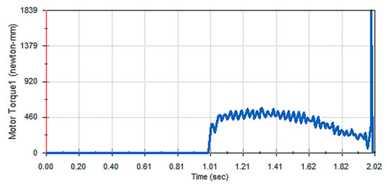 Once the initial design phase is concluded, a motion analysis is conducted to assess the ability of the design to achieve the desired range of motion and to identify any necessary modifications. Additionally, a motion analysis is employed to calculate the torque that is necessary to accomplish the intended motion. Given the constraints of simulating real-world conditions, the motion study simulation is performed using available aluminum contact settings. The torque required to rotate the mechanism and execute the desired action is depicted in the chart presented in Figure 13.