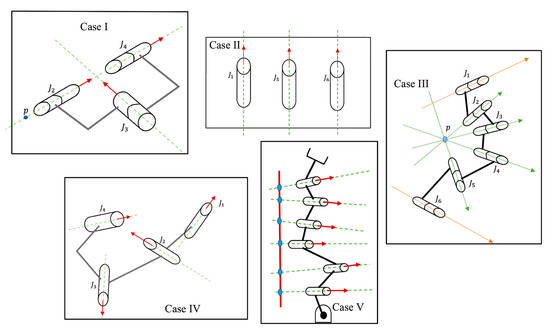 For a serial 6-DOF robotic arm, there are several cases or conditions of singularity, and this study focuses on the five most common cases explained below as well as depicted in Figure 14.