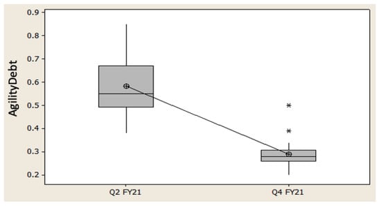 Boxplot AgilityDebt™ IT: Q2-FY21, Q4-FY21. A box-plot chart with two datasets is useful for comparing the distribution of two numerical sets and can provide valuable information about the median, interquartile range, and outliers of the data (represented as asterisk in the plot).