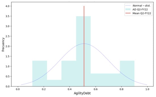 This analysis yields a baseline for the second quarter of the fiscal year 2022 (Q2-FY22) of 0.51 on average and 0.19 in terms of dispersion (standard deviation), as shown in Figure 4 and Table 1. As previously explained, the scale of this index ranges from 0 to 1, where 0 represents low debt and high agility, and 1 represents high debt and low agility. In this sense, having a score of 0.51 represents a medium or regular agility, and as our Agile Enterprise Vision inspires us to the Zero-For-Tomorrow (0-4-2), which means achieving zero agile debt and consequently enabling high enterprise agility, we decide to create an improvement team [11,25] with the aim of significantly reducing CBO AgilityDebt™ in the organization.