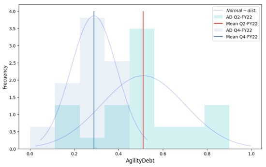 We used statistical analysis to objectively demonstrate that the change or improvement exhibited in the AgilityDebt™ after the actions implemented by the transformation team corresponds to a statistically significant finding and is not something that results from the randomness of the data and its sampling error [34].