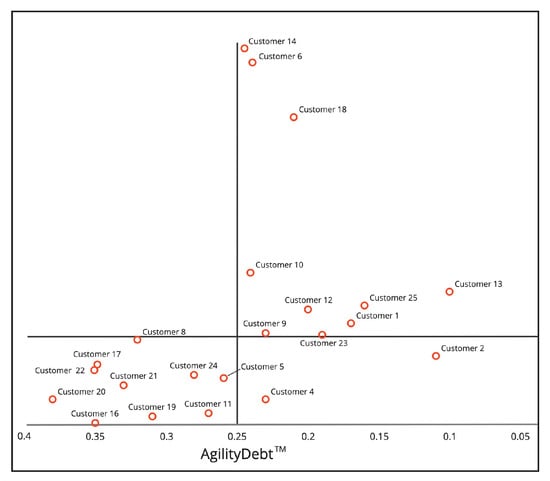 In Figure 10, the correlation between the level of AgilityDebt™ calculated by TCS clients and the commercial growth rate they have exhibited can be appreciated.