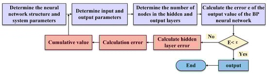 The BP neural network is a multilayer feed-forward supervised artificial neural network that identifies the nonlinear connection between input and output information by simulating a real brain’s processing mechanism. The weights and thresholds between each neuron are constantly adjusted during the training process, and the reverse transmission of the input signal and the error signal is carried out [44], as shown in Figure 1 [45].