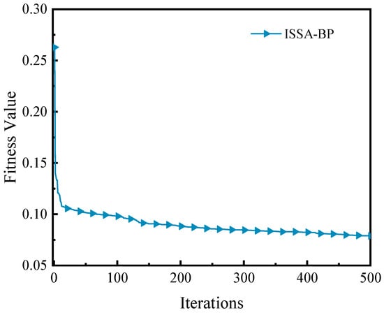 BP neural network starting weights and thresholds have a profound influence on model prediction accuracy, and the PSO algorithm tends to lead to premature convergence in the late iteration. The goal of utilizing ISSA to improve BP neural networks is to acquire the ideal weights, thresholds, and fitness values for better prediction outcomes. Therefore, the ISSA algorithm is used in this study to improve the BP neural network.