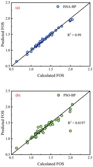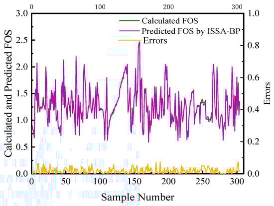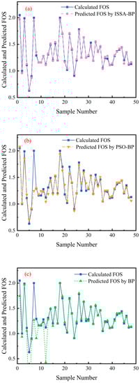 In summary, the comparison of the predicted and actual values and the study of each of the model’s error outcomes show that the ISSA–BP’s projected values were closer to the real values and had a better prediction performance. Therefore, among the intelligent prediction models of the slope safety coefficient, the ISSA–BP had the best prediction effect, followed by the PSO–BP’s prediction effect, while the BPNN had the worst prediction effect due to its uncertainty.