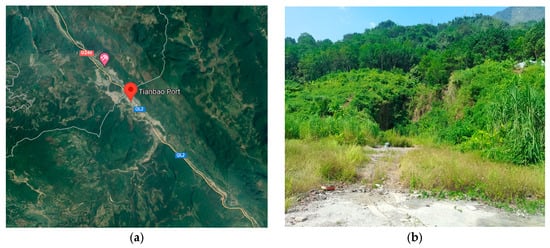 Land resources are the basis for human survival and development, and it is very important to formulate effective land planning. The site of the Tianbao border Police Station in the Wenshan Border Management Detachment is proposed to be built at Tianbao Port, Malipo County, Wenshan Prefecture, Yunnan Province, which belongs to the mid-mountain landform. The monitoring area has a subtropical plateau monsoon climate, with an annual average temperature of 17.6 °C and precipitation of 1068 mm. The elevation in the proposed project area is between 70 and 128.65 m, and the slope of the terrain is approximately 25–50°. The position of the 3–3′ engineering geological section is shown in Figure 12a. The top stratum of the site is mainly an artificial accumulation layer of the Quaternary system, and the underlying layer is a limestone layer of the Xiechang Formation of the upper Cambrian system, with well-developed joints and fissures. The current situation of the site is shown in Figure 12b, where the vegetation is lushly distributed. The stability of the slope in the monitoring area directly affects the safety of the proposed Tianbao border Police Station, so it is necessary to analyze the slope’s stability.