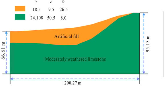 According to the geological data extracted from the field investigation and drilling, the stability of the slope was evaluated, and a two-dimensional model of the slope in the monitoring area was established using the Lizheng slope stability calculation software. The established model is shown in Figure 13.