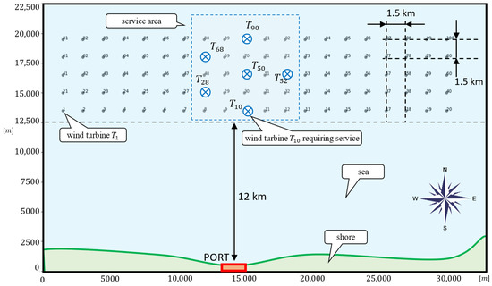 Consider a situation in which 6 WTs, , await technical inspection (repairs) and are located in the service area (marked as blue crossed circles in Figure 1).
