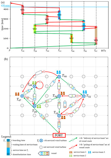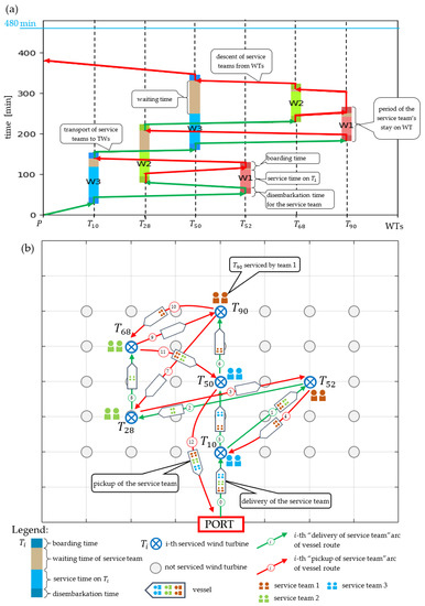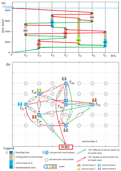 An illustration of a proactive mission plan (determined before it begins) is shown in Figure 2a,b. The first subfigure presents a schedule of service activities that guarantees their completion before the assumed planning horizon . Along the X-axis, there are serviced turbines, while the Y-axis represents time. Figure 2b depicts the route of a vessel that distributes and receives service teams . The vessel first sails to and leaves service team 3 there; then sails to , where it leaves team 1; then sails to , where it leaves team 3; and so on until the mission is completed. The mission duration is equal to min and the costs is m.u.