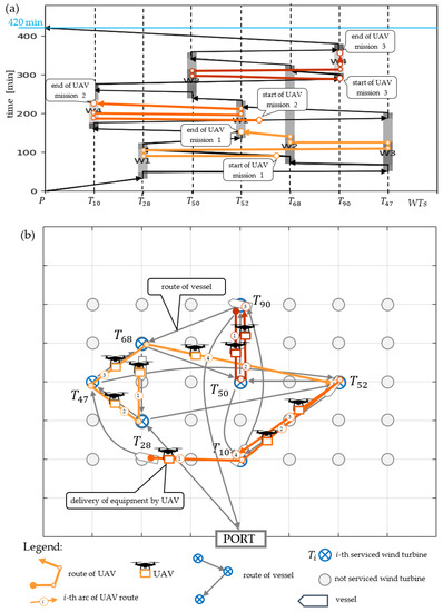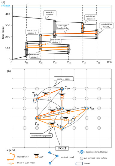 For such a designated mission, two deadlines are set for the delivery of equipment necessary to service the turbines. At , the WT equipment supply window starts, , , and ; at , the WT supply window begins, , , and An example of a plan for the supply of WT equipment using the available UAV () is presented in Figure 3, illustrating the reactive planning approach. The UAV carries out two missions. In the first one (starting at the 65th minute), the UAV flies to , then , and then . In the second mission (starting at the 200th minute), the UAV flies to , then , and then .